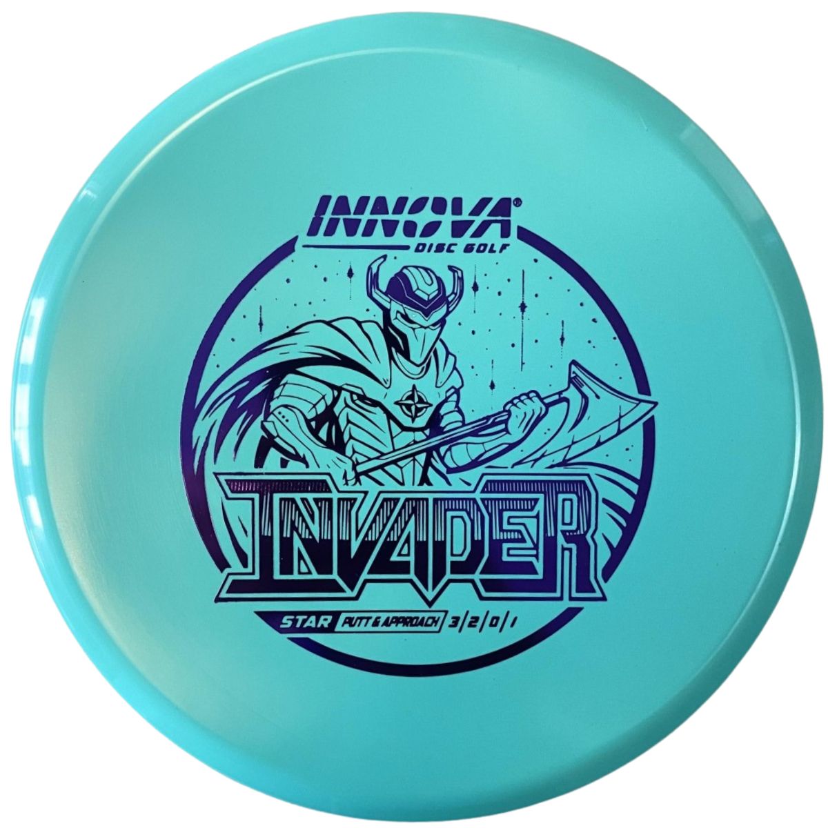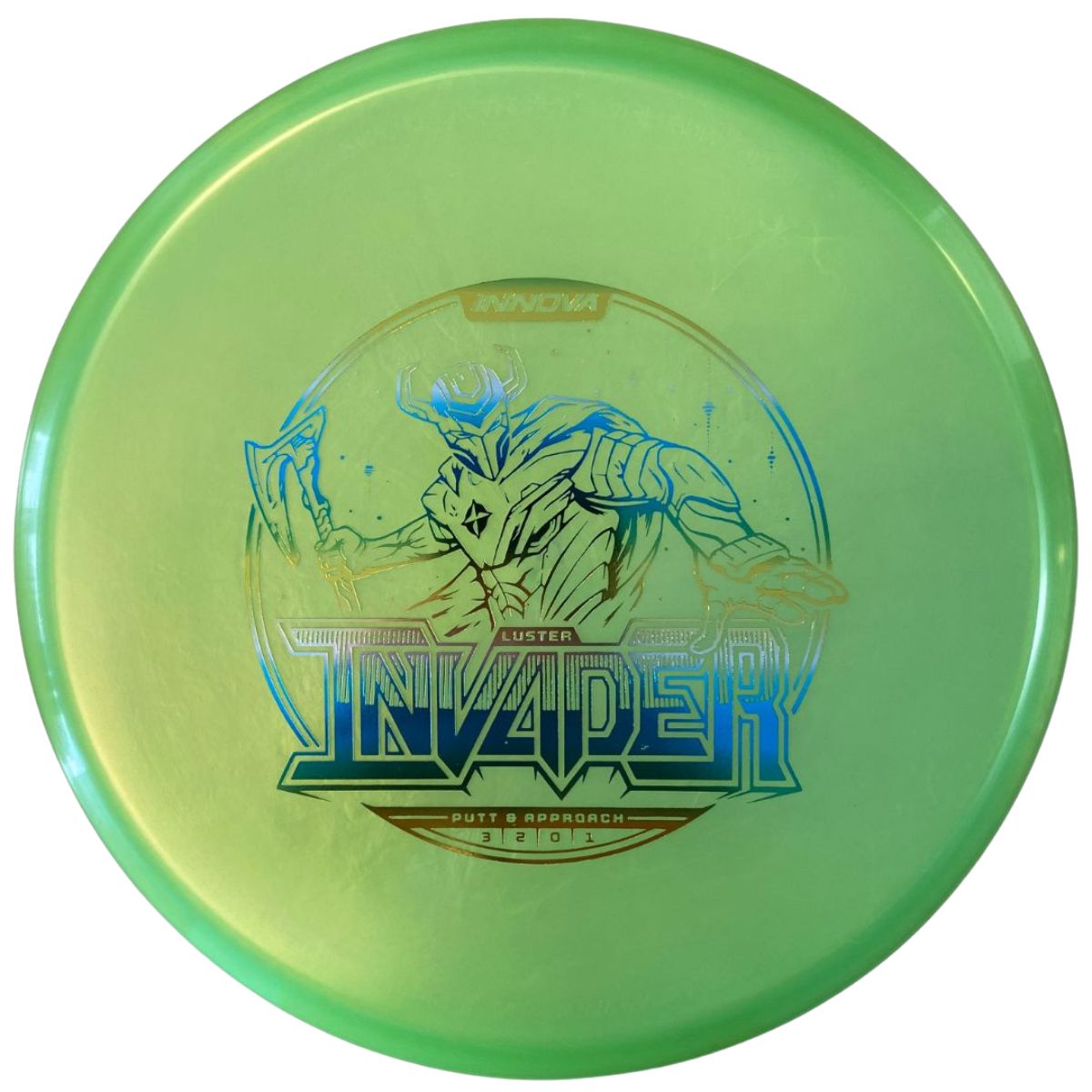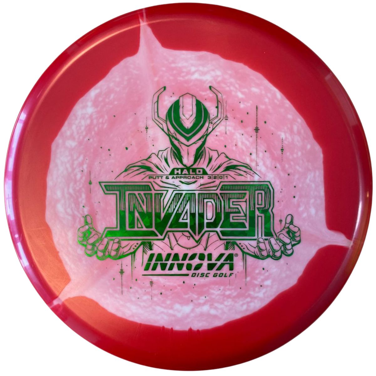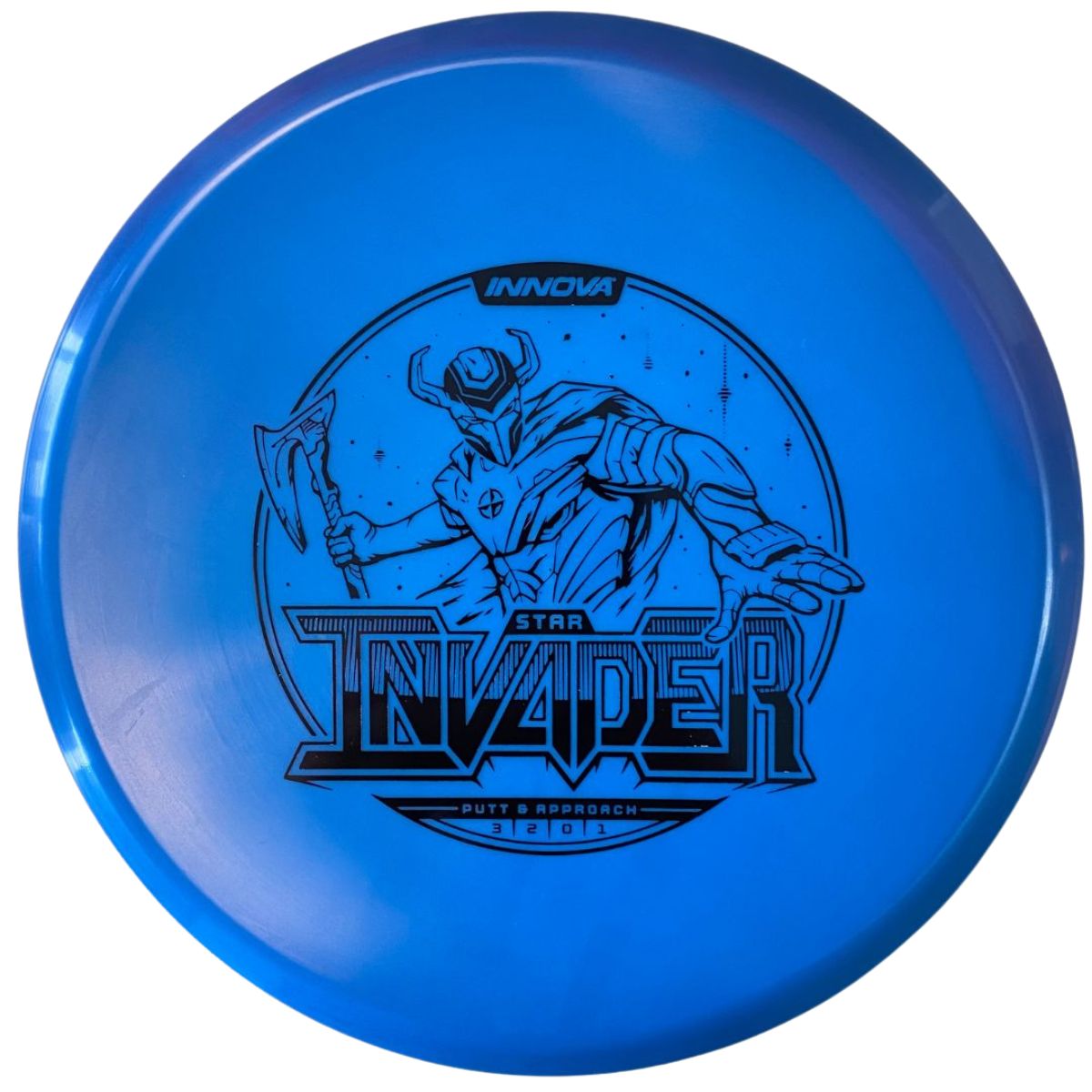 The Innova Invader is a flat-top, stable driving putter with a small bead. Excellent for forehand and backhand throws, especially in Luster or Halo plastic.