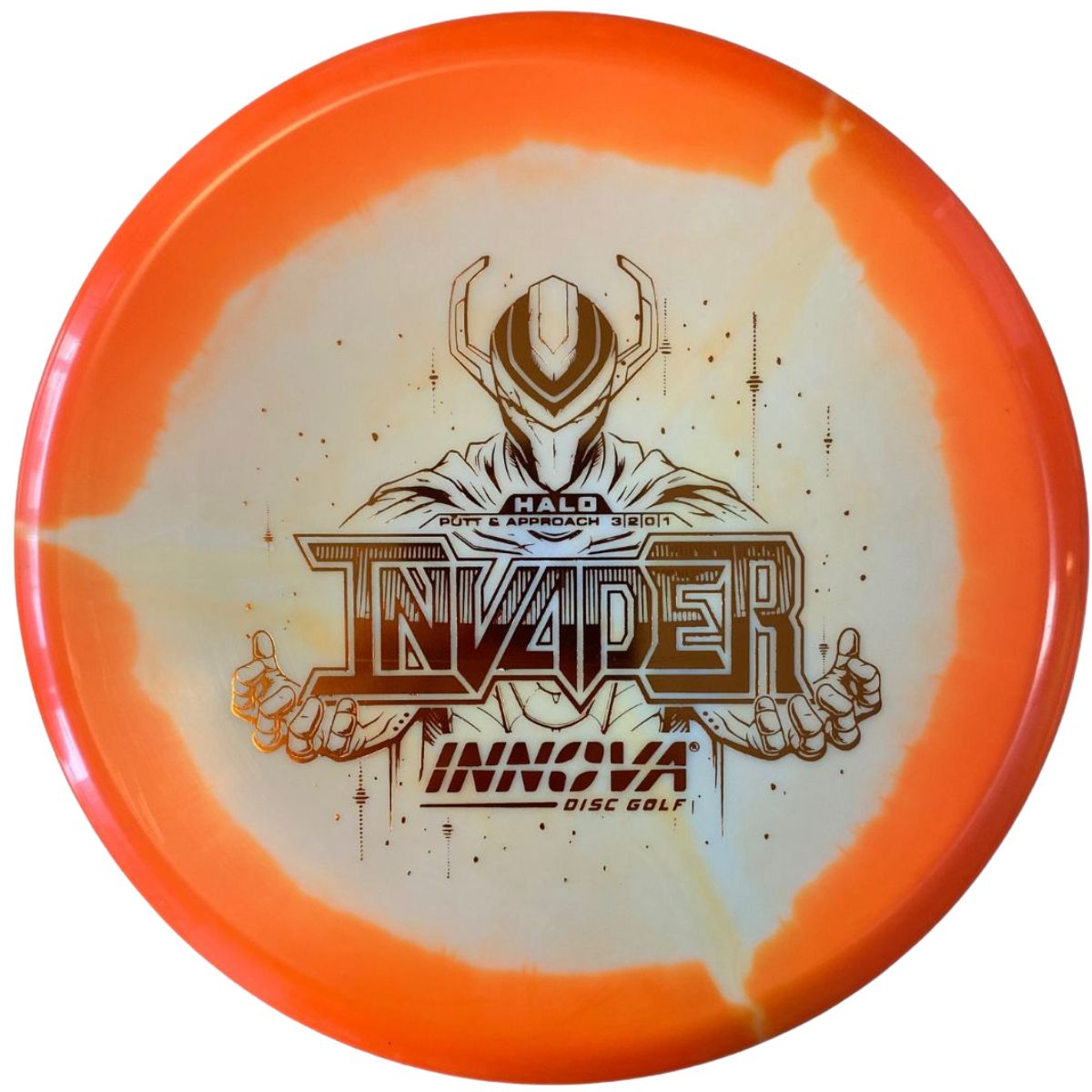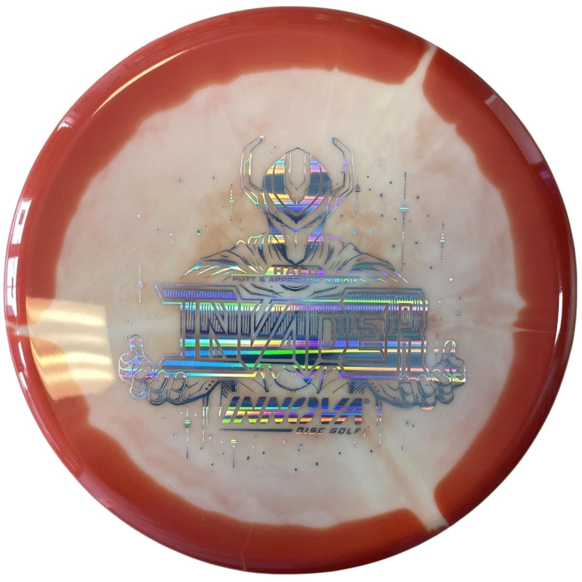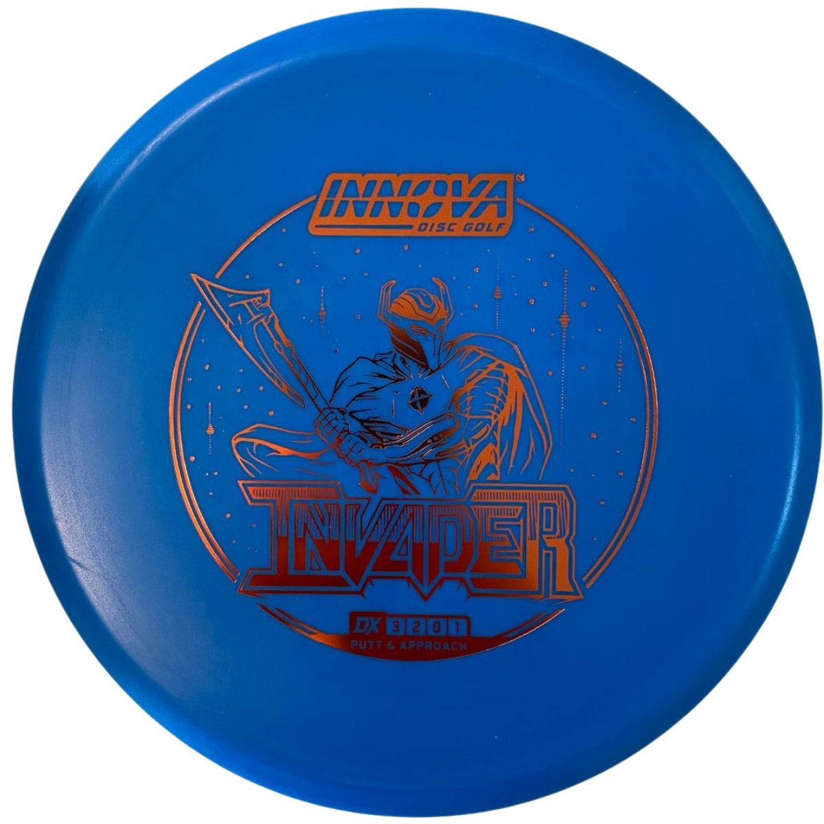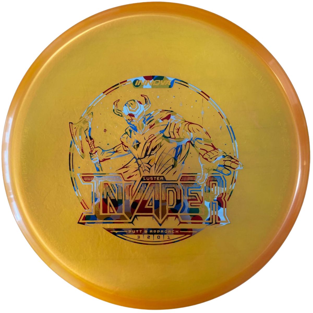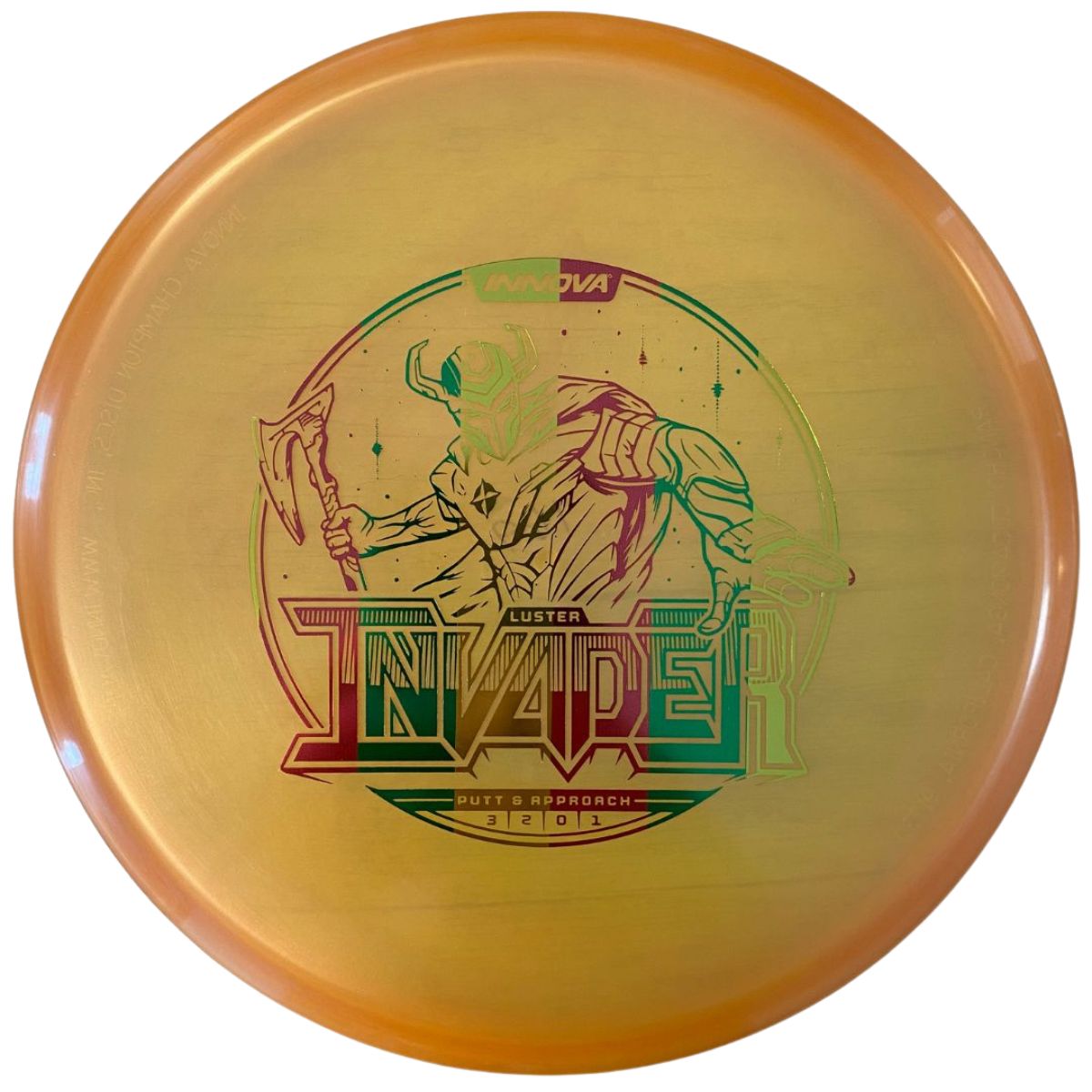 The Innova Invader is a flat-top, stable driving putter with a small bead. Excellent for forehand and backhand throws, especially in Luster or Halo plastic.